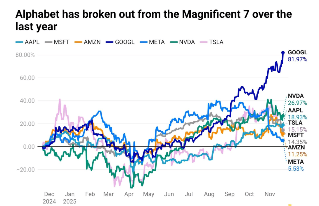 Wall Street parece creer que Alphabet ha tomado el impulso contra sus pares del Magnificent 7 y otros nombres de IA.