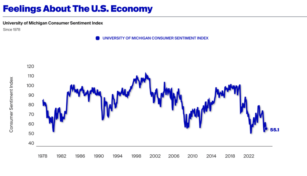 Esto se refleja en datos de sentimiento del consumidor históricamente negativos.