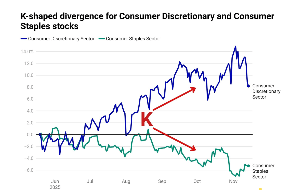 Esta tensión - el empeoramiento del sentimiento junto con mercados en auge - forma el núcleo de la narrativa en forma de K.