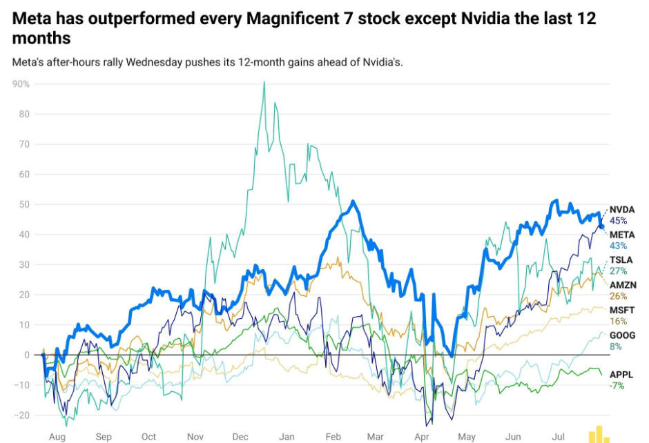 Todo lo anterior ha ayudado a Meta a superar a la mayoría de sus competidores en IA el año pasado, con un repunte del 50%.