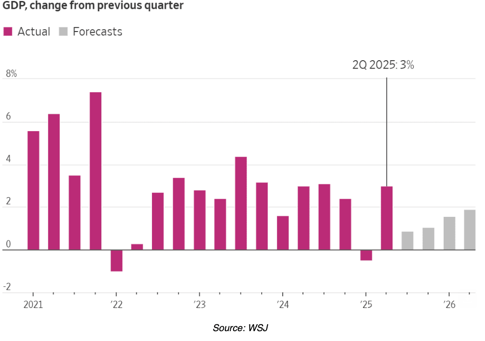 Por ejemplo, dicho crecimiento se debió principalmente a una caída de las importaciones, no a un aumento de la actividad económica. En el primer trimestre, las empresas se apresuraron a adelantarse a los aranceles, lo que impulsó las importaciones un 37,9%. Ese aumento casi se evaporó en el segundo trimestre, cuando las importaciones disminuyeron un 30,3%, lo que a su vez contribuyó a impulsar el PIB. El gasto del consumidor aumentó un 1,4%, mejor que el 0,5% del trimestre anterior, pero aún más lento de lo esperado.