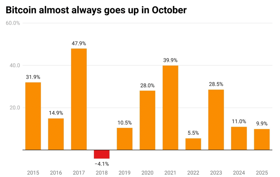 Bitcoin ha cerrado al alza en 9 de los últimos 10 octubres con un rendimiento promedio de más del 21.4%.