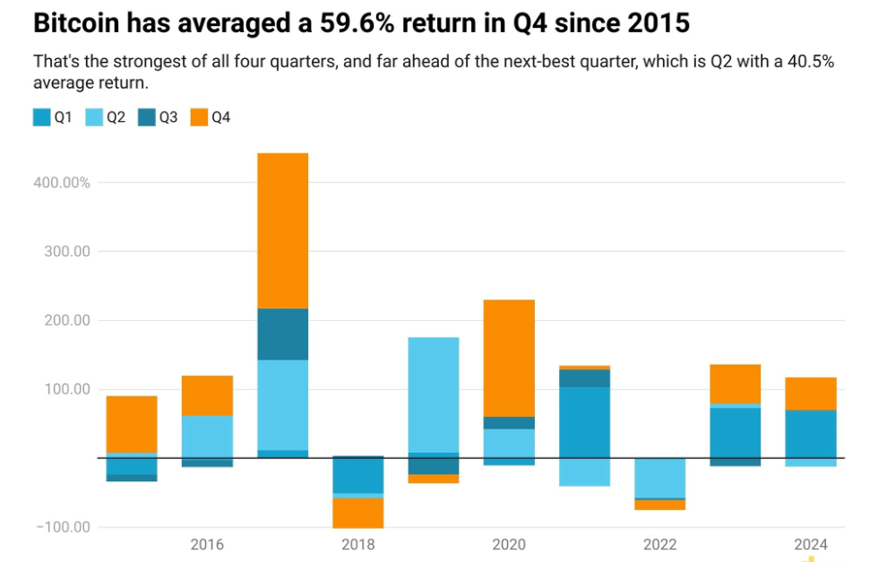 Esta fortaleza se aplica a todo el cuarto trimestre. Durante los últimos 10 años, bitcoin ha visto un rendimiento promedio del 59.6% durante los últimos tres meses del año, casi el doble que el segundo mejor trimestre.