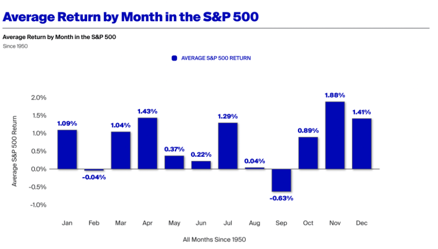 Desde 1950, el S&P 500 ha promediado una ganancia del 4,2% de octubre a diciembre, con rentabilidades positivas el 80% del tiempo.