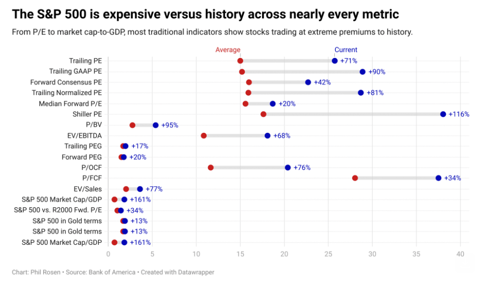 El PER de Shiller se sitúa en más del doble de su promedio a largo plazo, por ejemplo, mientras que el valor total del mercado es de 1,8 veces el PIB.