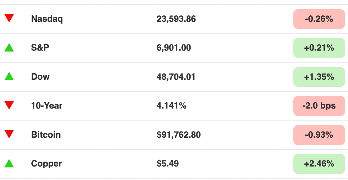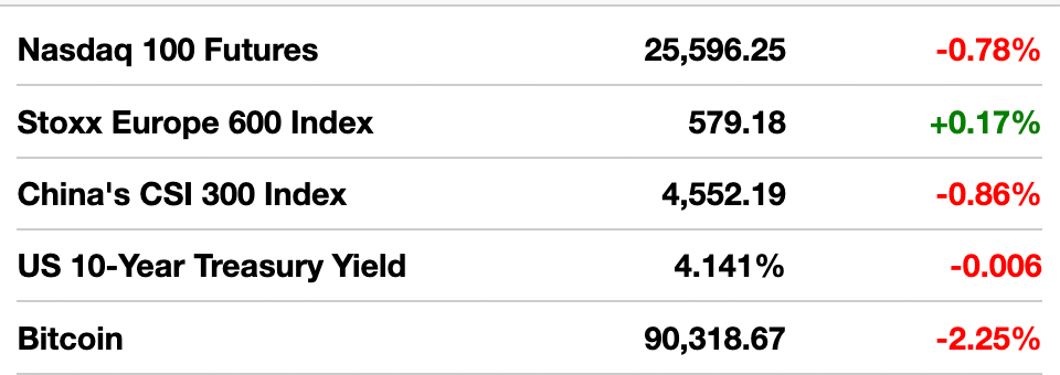 Como dijimos ayer, está bastante tranquilo por ahí con las fiestas navideñas a la vuelta de la esquina. No hay reportes económicos importantes ni informes de ganancias de nota, pero eso no significa que debas desconectarte del mercado. Mantente atento a los discursos y comentarios de varios banqueros centrales hoy, que nos deberían dar algunas pistas sobre el estado de una Reserva Federal dividida. Escucharemos a la presidenta del Fed de Filadelfia Anna Paulson, la presidenta del Fed de Cleveland Beth Hammack, y el presidente del Fed de Chicago Austan Goolsbee.
