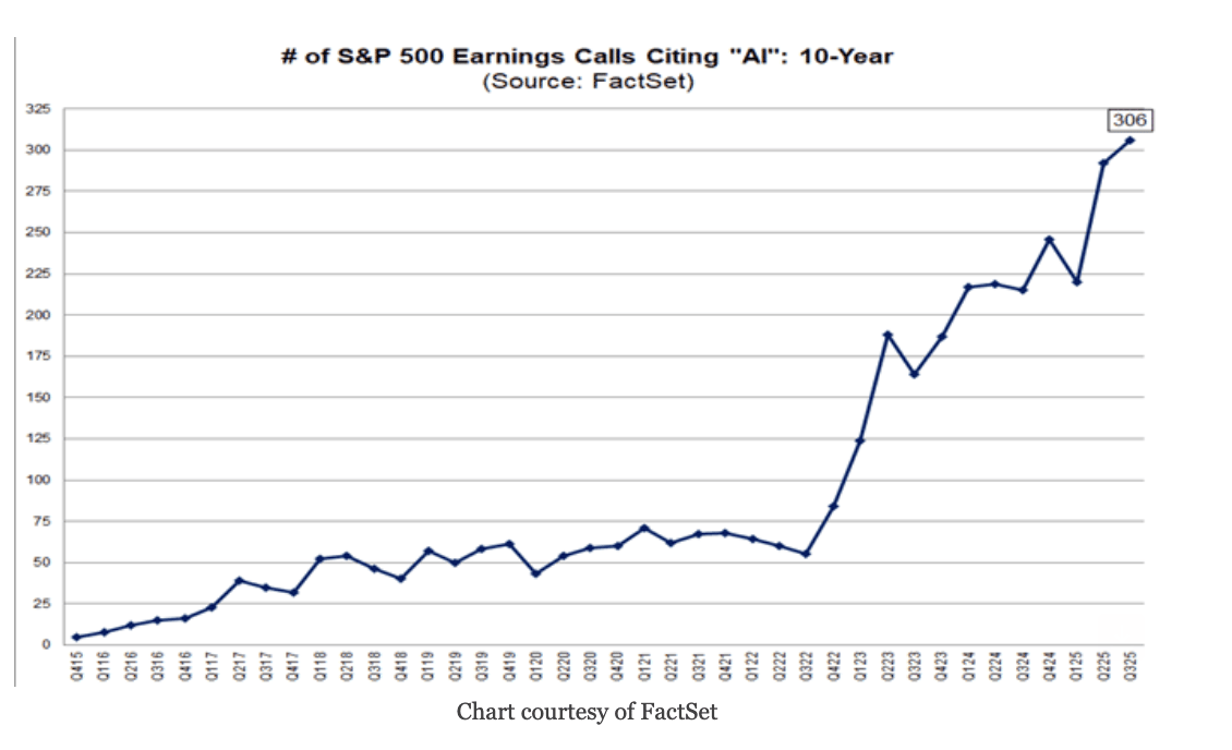 La tecnología que se desarrolla rápidamente está tan presente en la mente de las empresas estadounidenses que un récord de 306 empresas del S&P 500 mencionaron "IA" en su llamada de ganancias en el último trimestre, según FactSet.