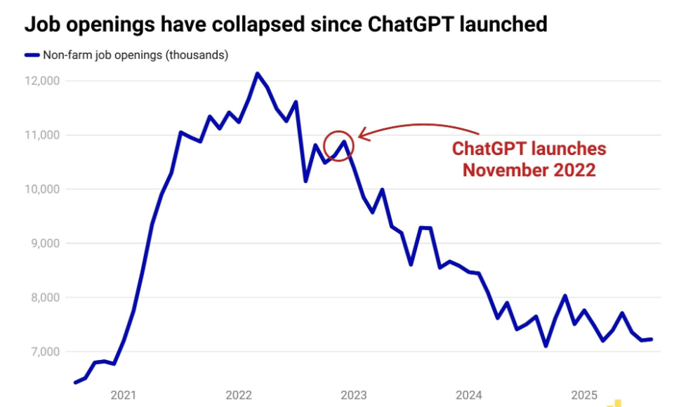 Es cierto que las ofertas de trabajo han caído bruscamente desde que OpenAI lanzó ChatGPT y dio inicio a la revolución de la IA, pero eso sucedió en concierto con el aumento de tasas y un retroceso estructural del mercado laboral saliendo de la pandemia.