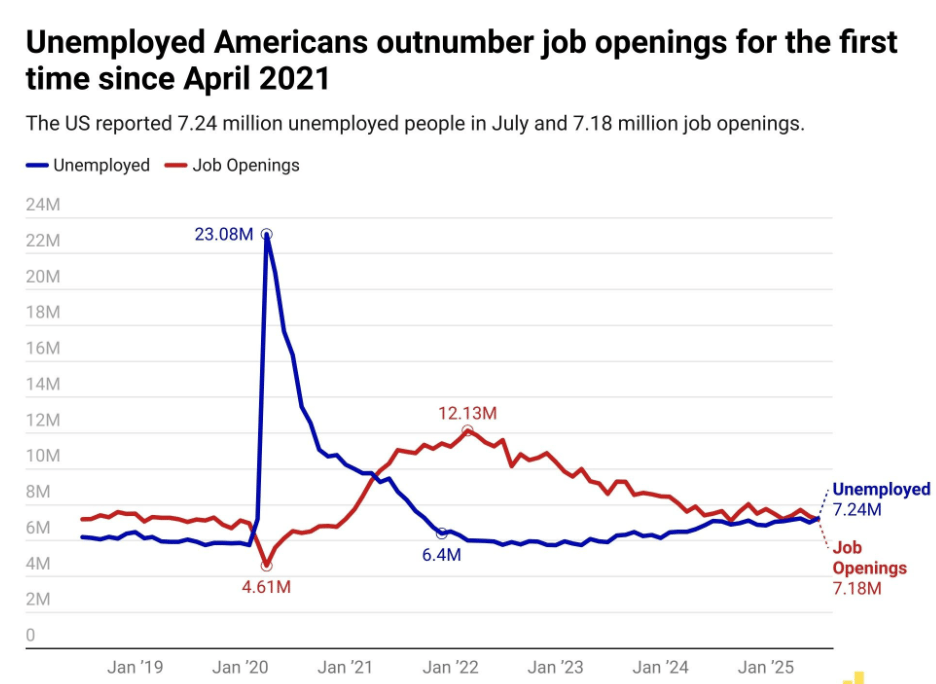 La encuesta JOLTS del miércoles reveló que el número de estadounidenses desempleados supera las vacantes de empleo por primera vez desde abril de 2021.