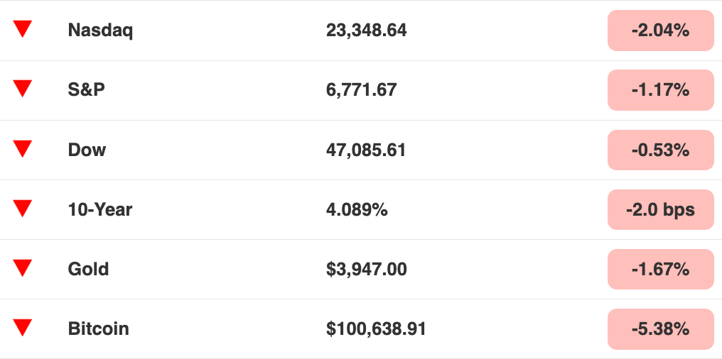 Las acciones de tecnología están cayendo por segundo día seguido porque los inversores están perdiendo confianza en las empresas de inteligencia artificial. Los futuros del mercado estadounidense se recuperaron un poco, pero los bonos y Bitcoin también están bajando.
