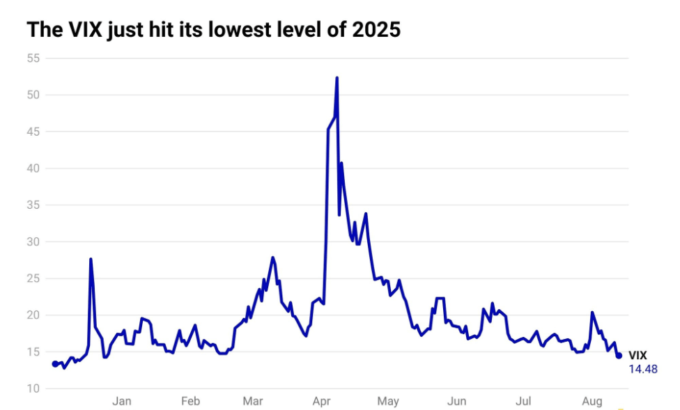 El VIX se desplomó a su mínimo de 2025 el miércoles, justo por encima de 14, aproximadamente un 30% por debajo de su promedio a largo plazo de 20, mientras que el S&P 500 alcanzó un máximo histórico por segundo día consecutivo.