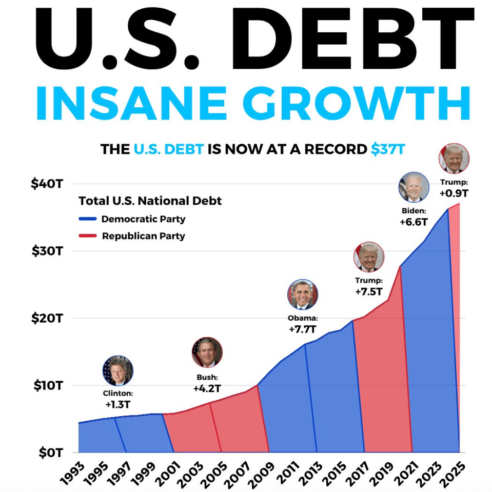 El aumento de la deuda refleja los totales de fin de año. Tomado del US TreasuryDirect, FRED e Investopedia.