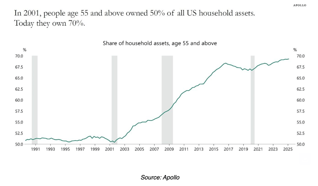 En 2021, las personas de 55 años o más poseían el 50% de todos los activos de EE. UU. Hoy poseen el 70%.